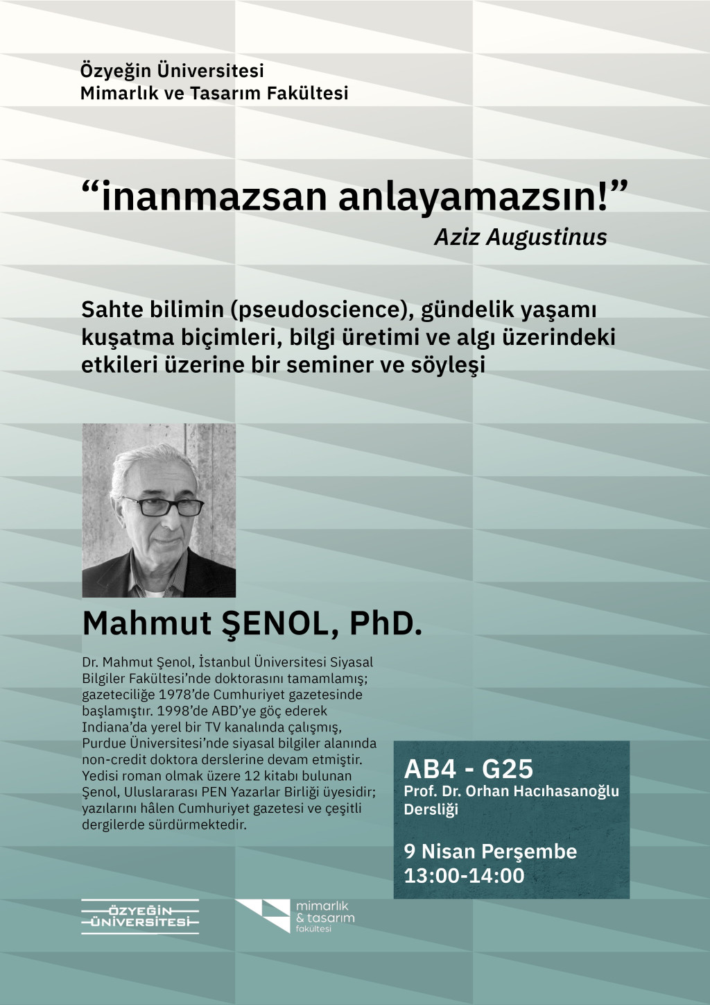 Dr. Mahmut Şenol will deliver a seminar titled “İnanmazsan Anlayamazsın!” (You Cannot Understand Unless You Believe!) on Thursday, April 9, 2026, between 13:00 and 14:00, at AB4 - G25 Prof. Dr. Orhan Hacıhasanoğlu Classroom.