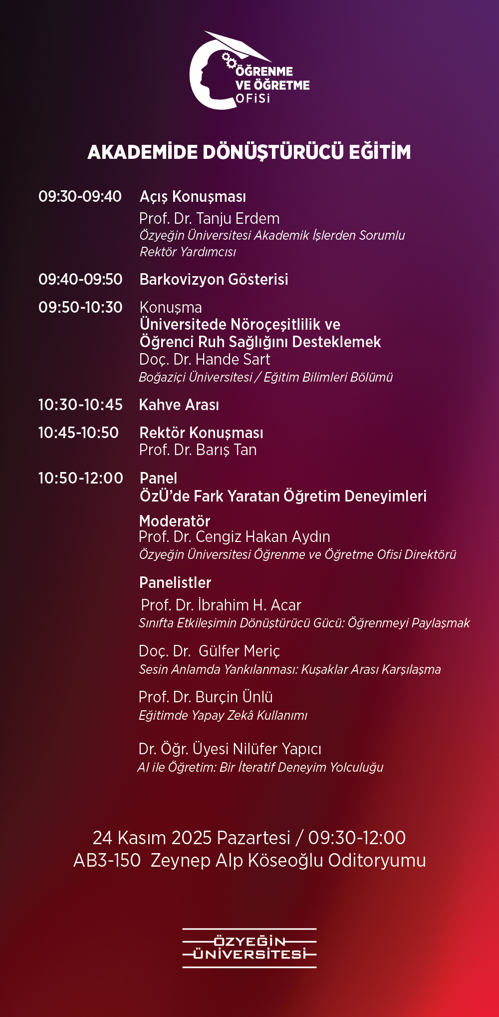 Program akışını duyuruda bulabileceğiniz etkinliğimizin, üniversitemizde dönüştürücü eğitim uygulamalarını ve öğrenci destek mekanizmalarını güçlendirmeye yönelik önemli bir paylaşım ve etkileşim ortamı sağlamasını hedefliyoruz.